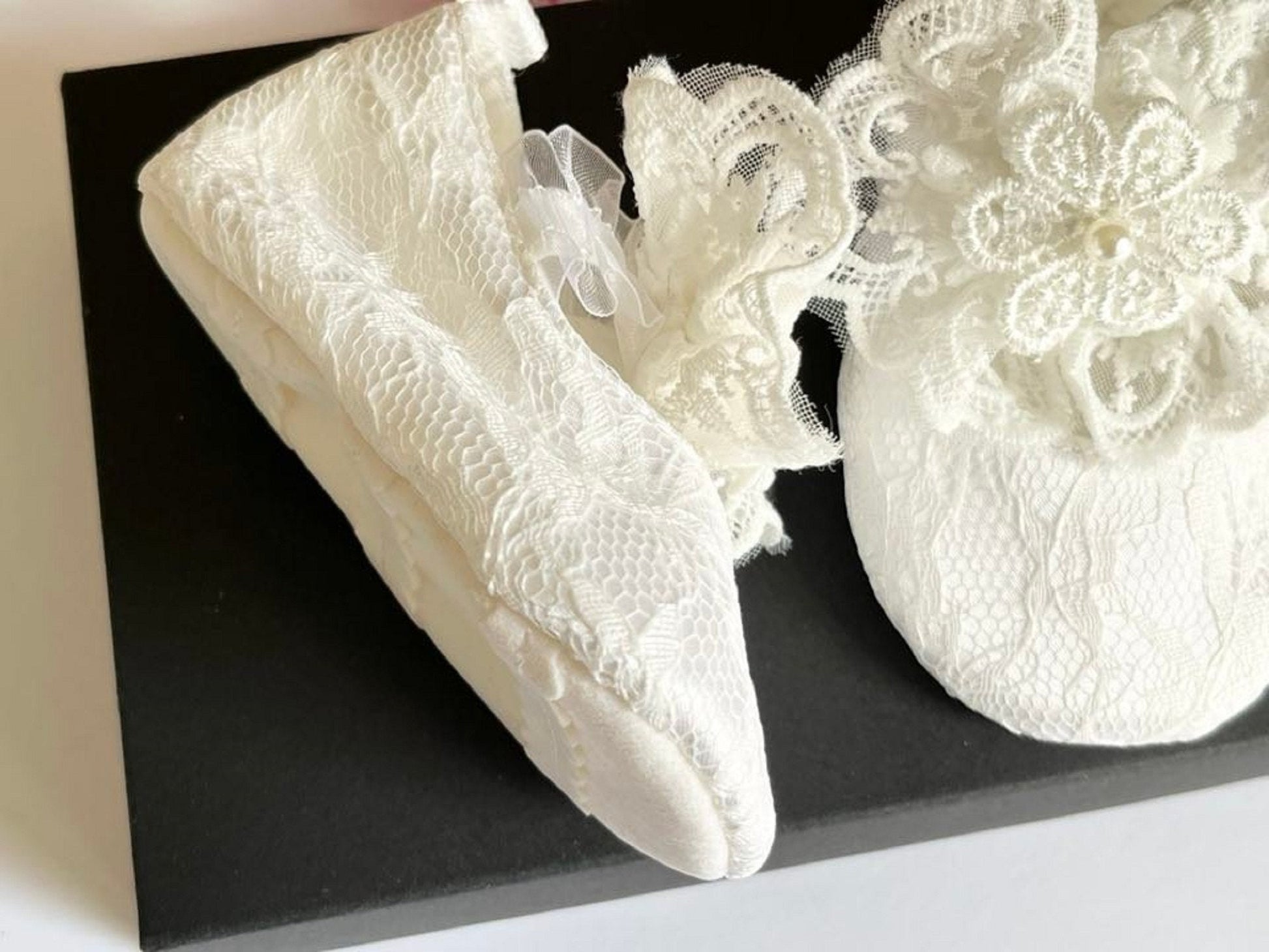 This pair lovely lace baby shoes are made of soft materials and lace. They are unique design for newborn baby, baby girls, flower girls, baptism, christening, etc.