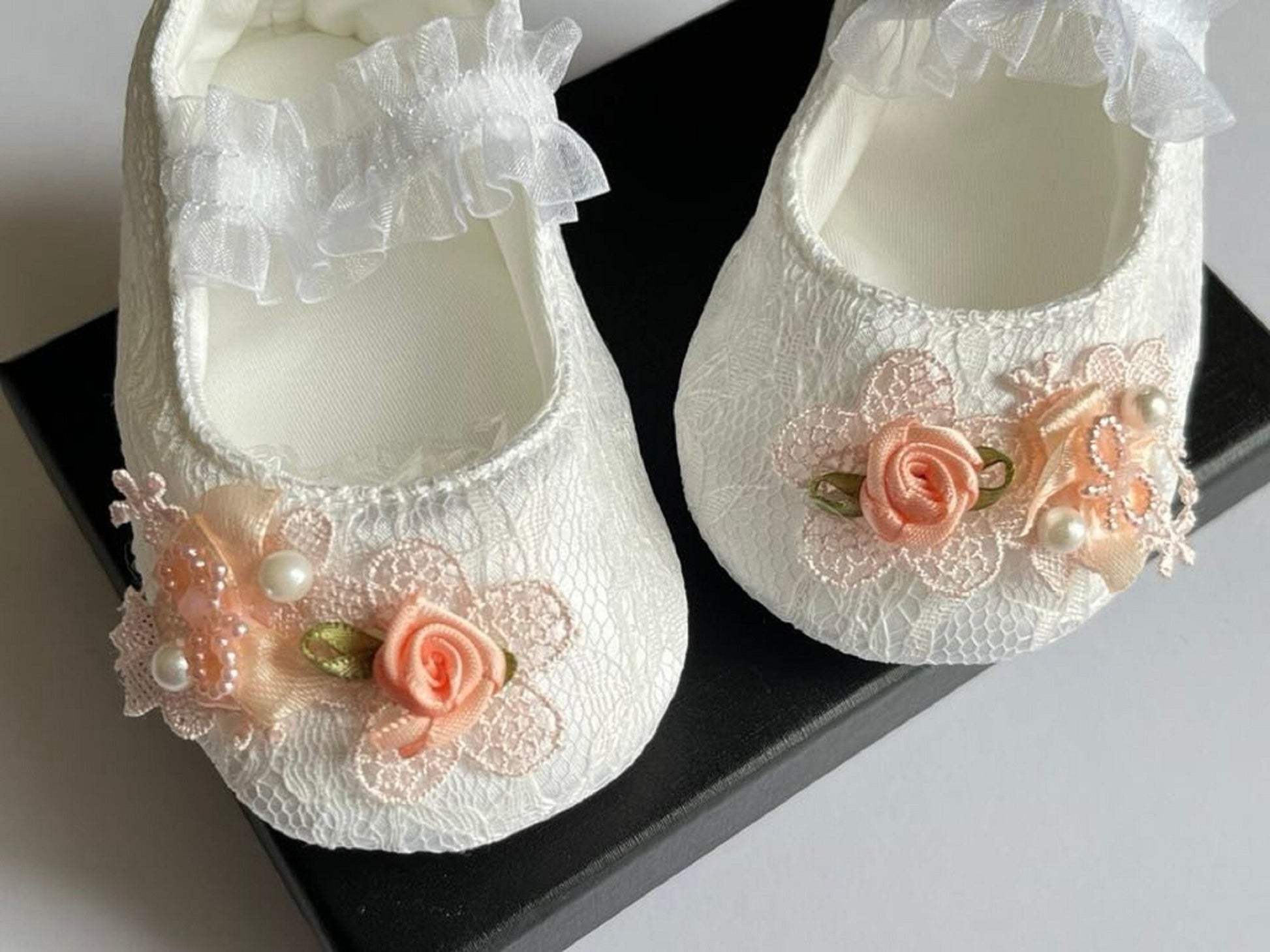 This pair lovely lace baby shoes are made of soft materials and lace. They are unique design for newborn baby, baby girls, flower girls, baptism, christening, etc.