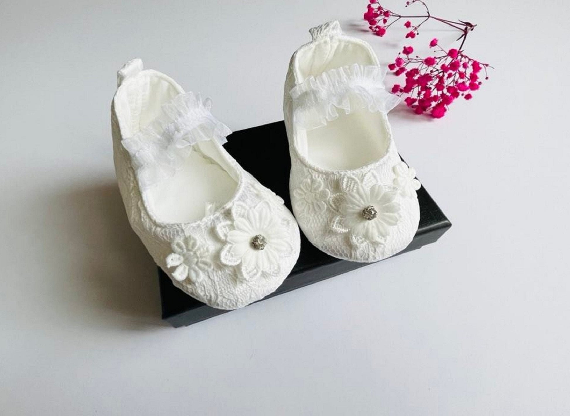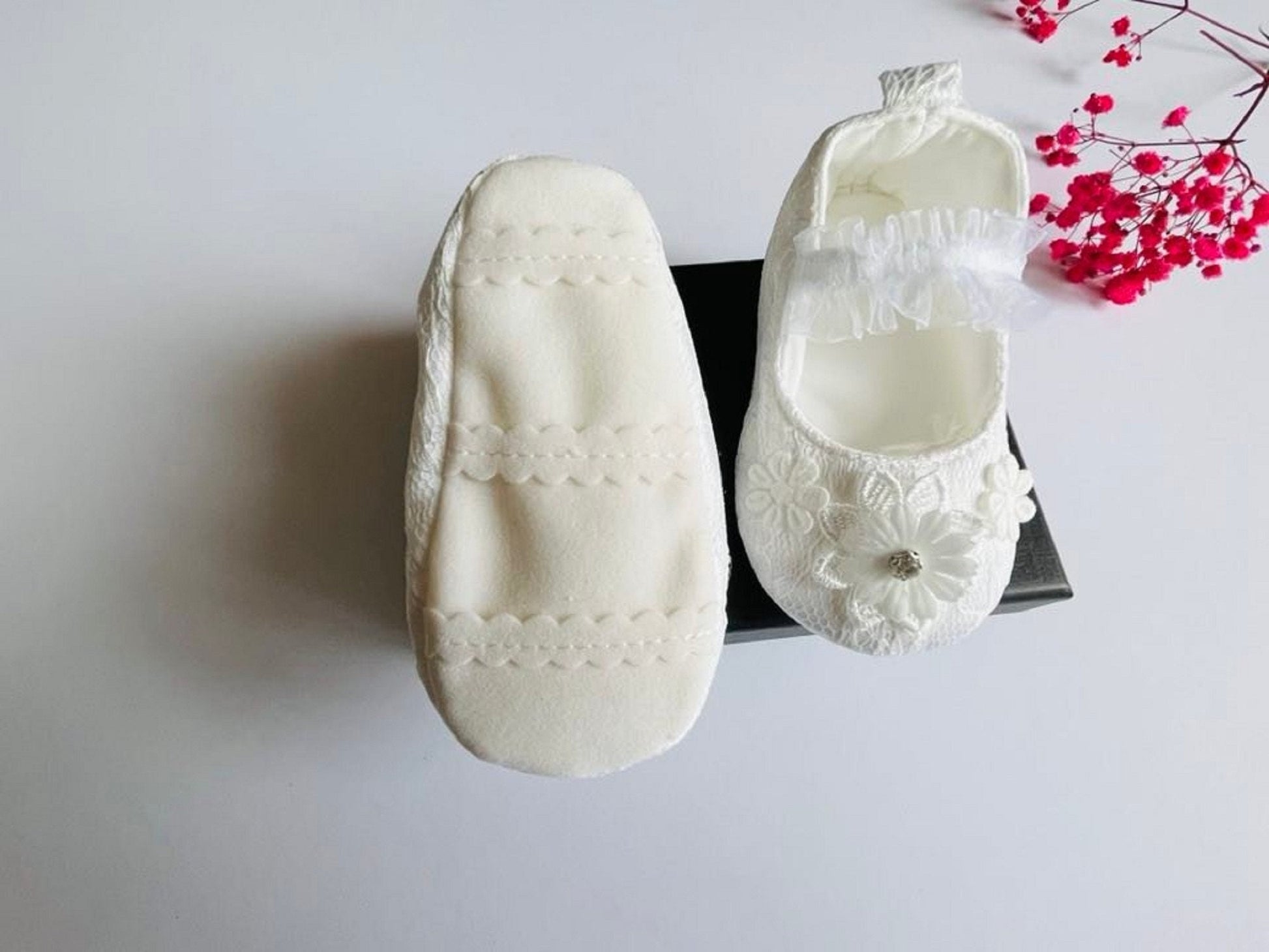 This pair lovely lace baby shoes are made of soft materials and lace. They are unique design for newborn baby, baby girls, flower girls, baptism, christening, etc.