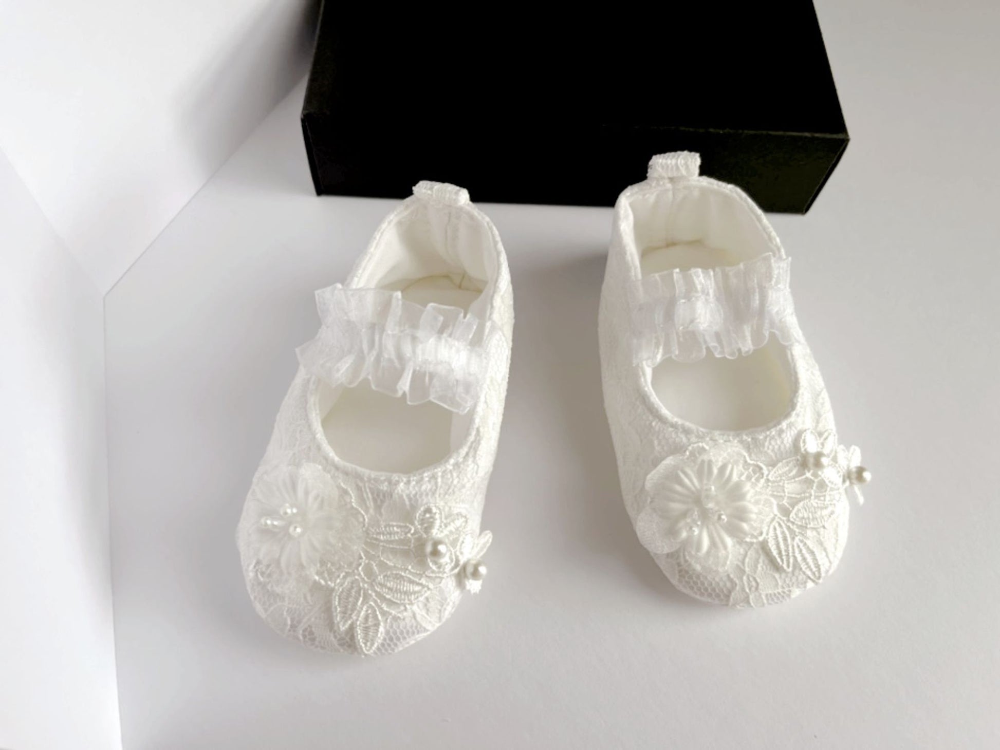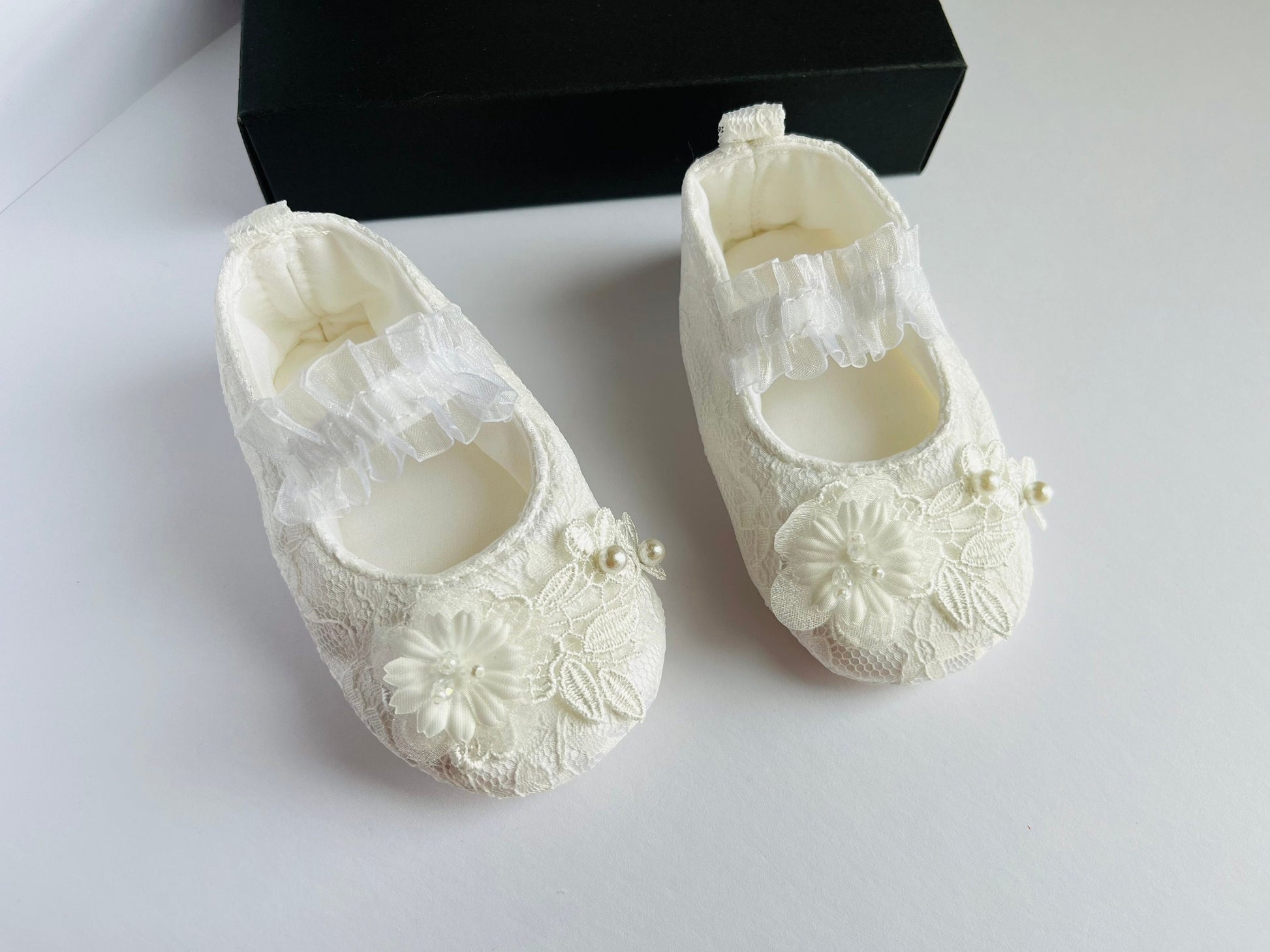 This pair lovely lace baby shoes are made of soft materials and lace. They are unique design for newborn baby, baby girls, flower girls, baptism, christening, etc.