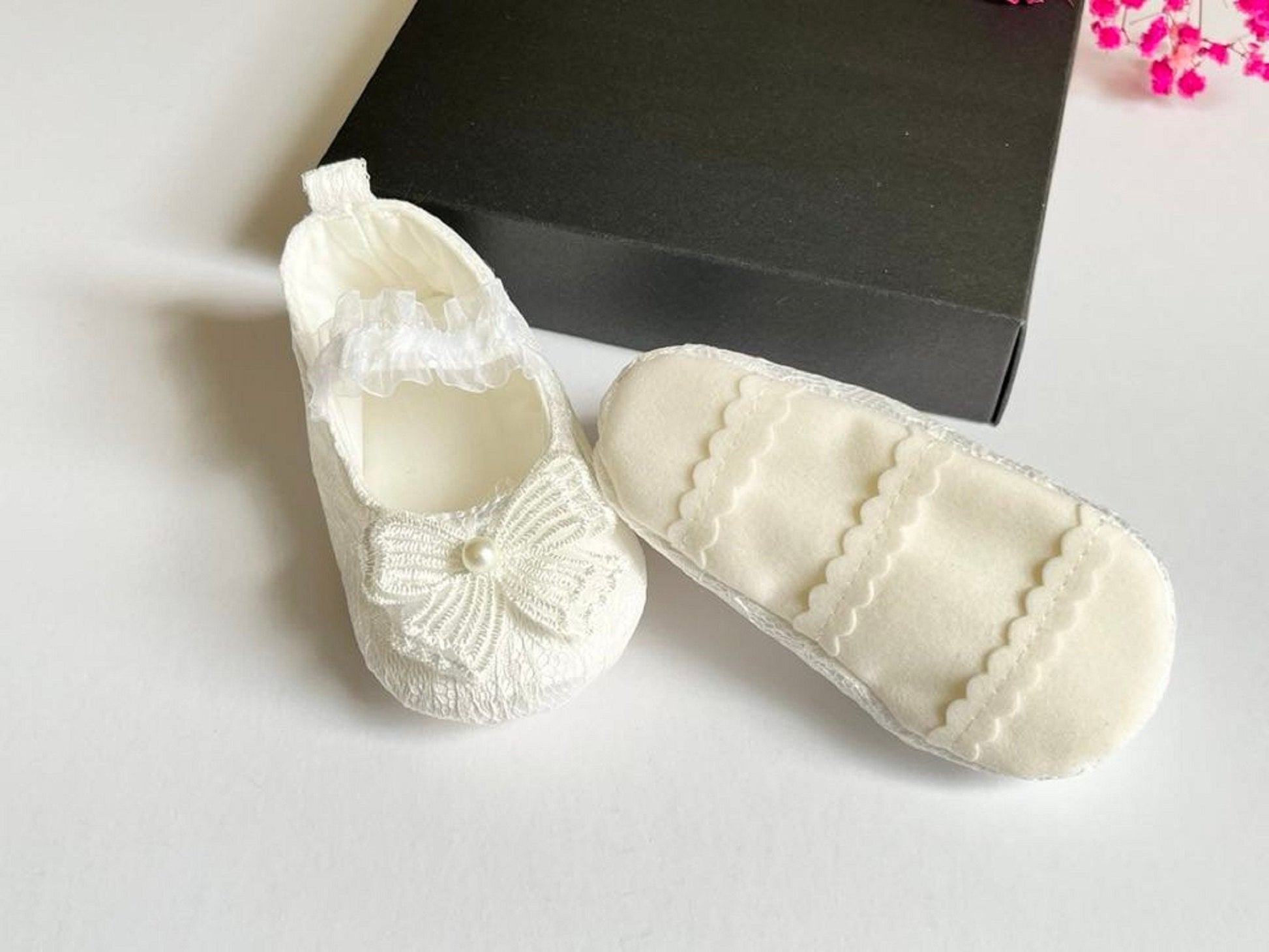 This pair lovely lace baby shoes are made of soft materials and lace. They are unique design for newborn baby, baby girls, flower girls, baptism, christening, etc.