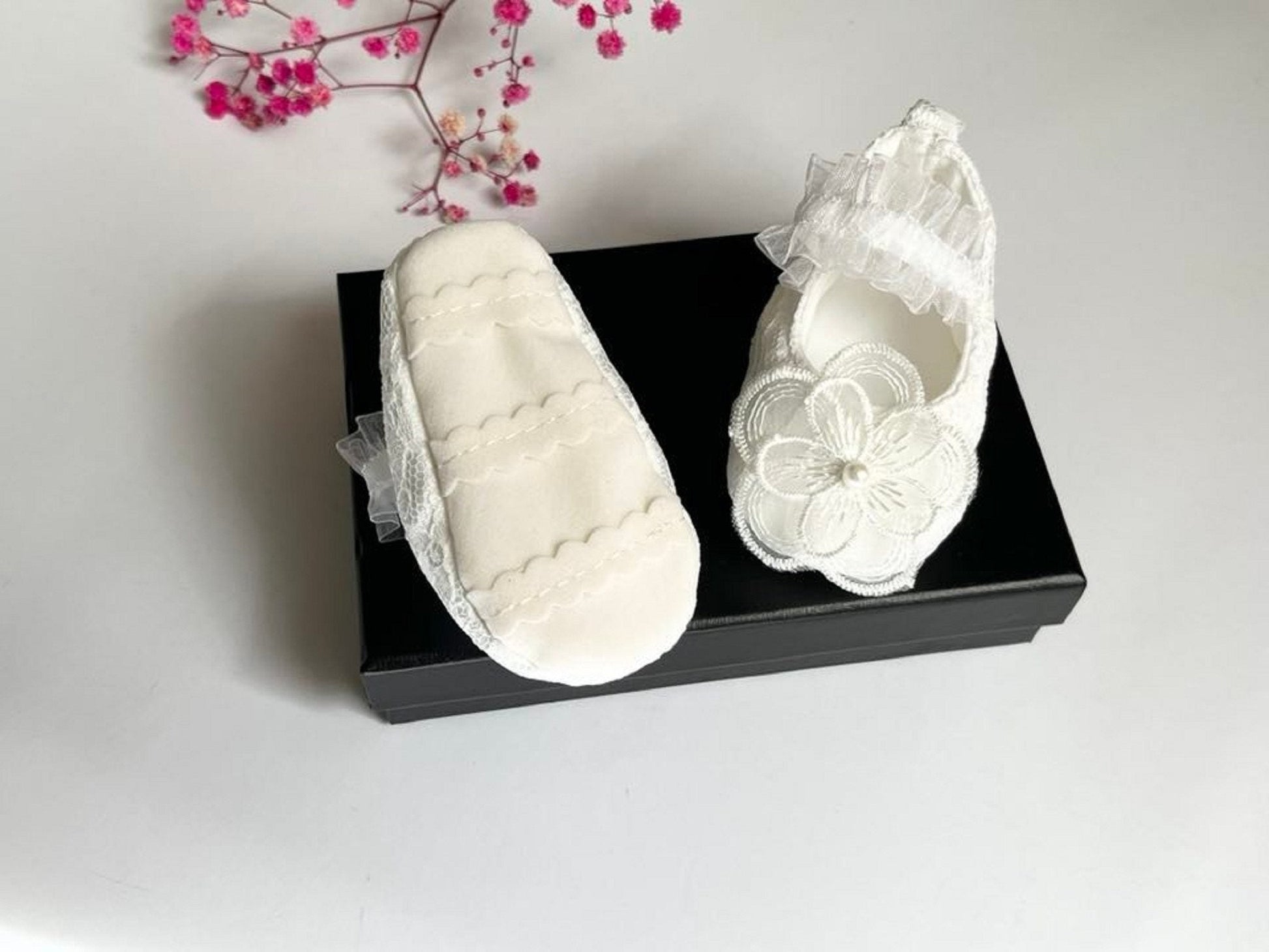 This pair lovely lace baby shoes are made of soft materials and lace. They are unique design for newborn baby, baby girls, flower girls, baptism, christening, etc.