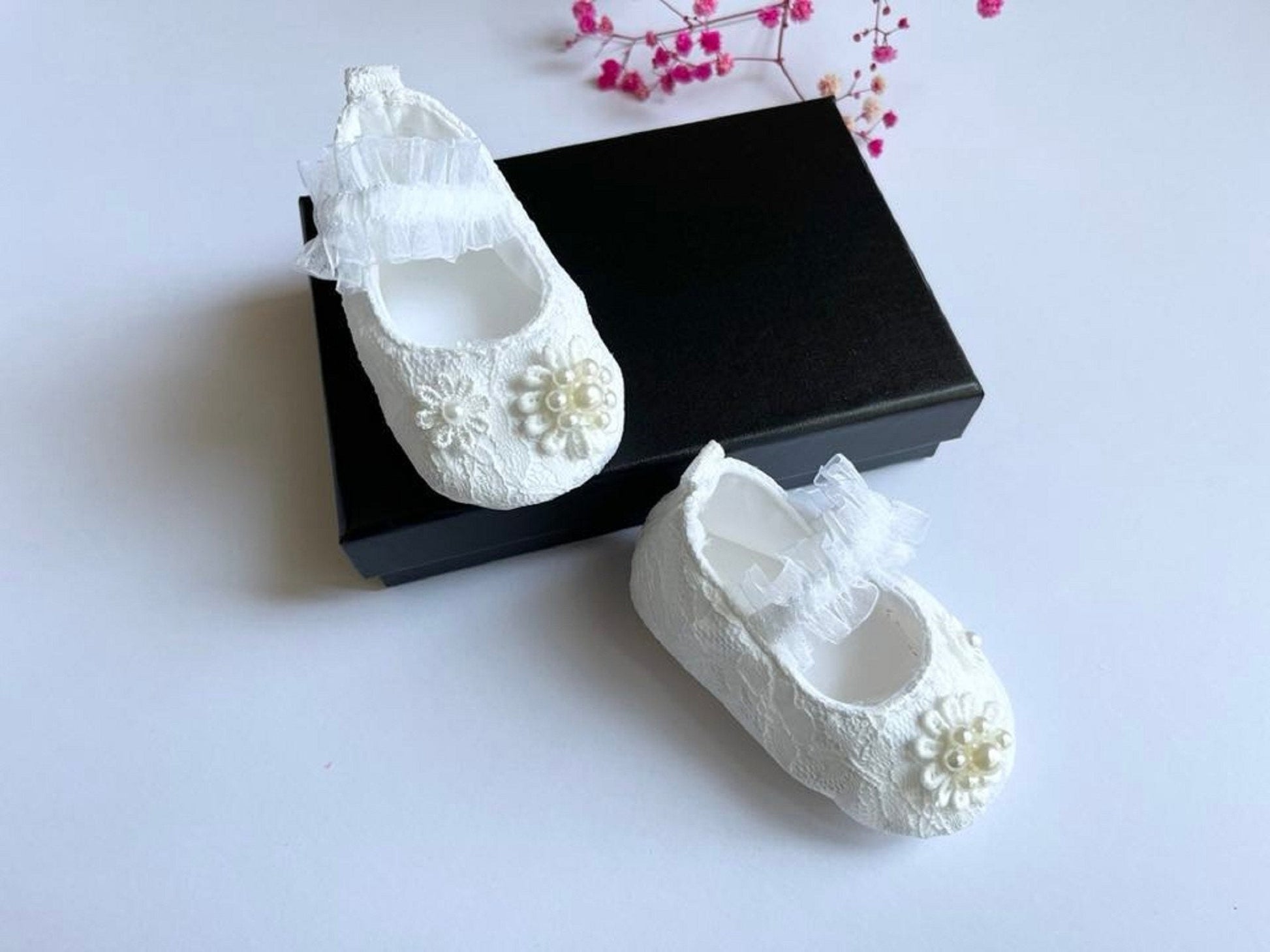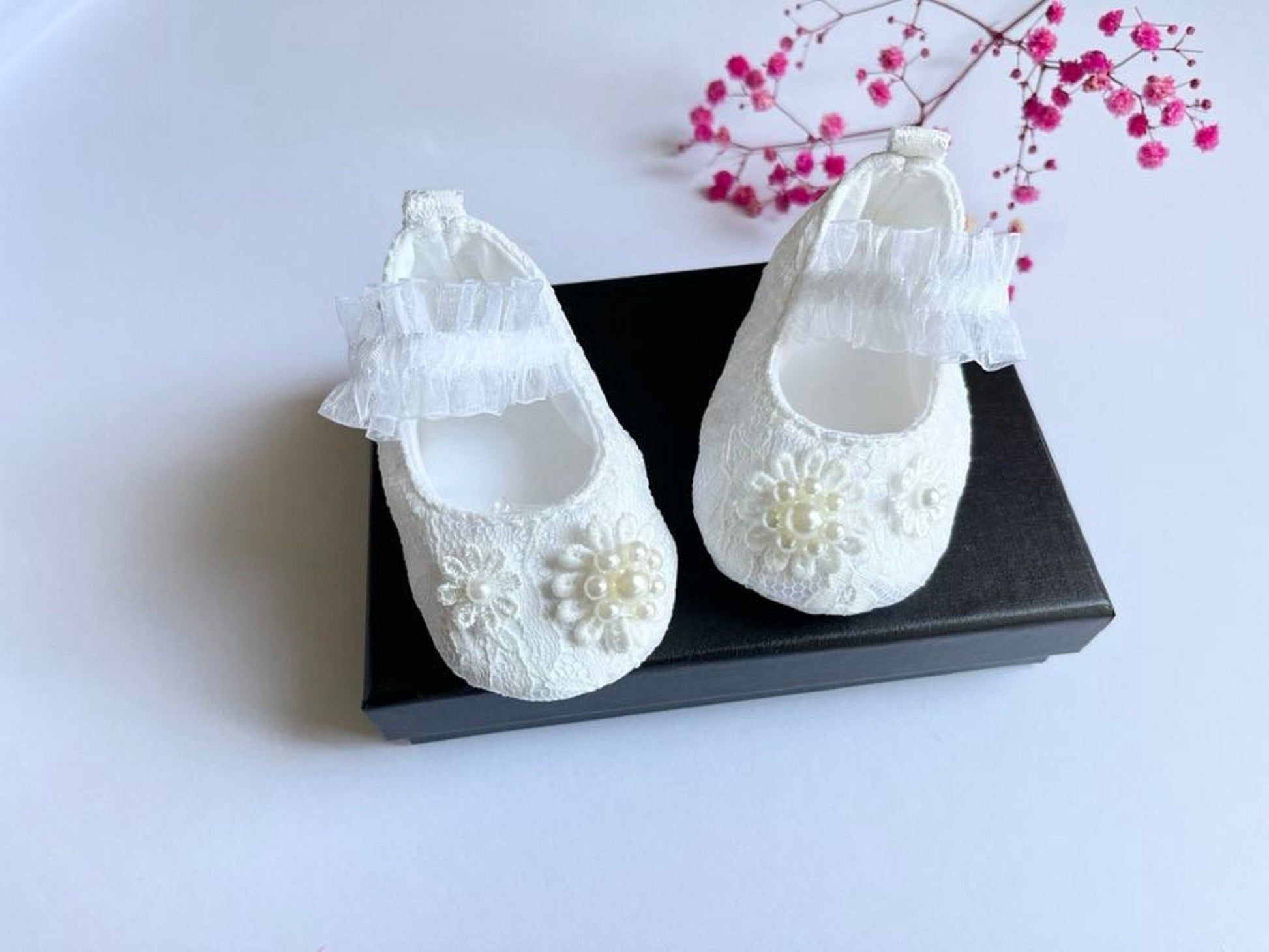 This pair lovely lace baby shoes are made of soft materials and lace. They are unique design for newborn baby, baby girls, flower girls, baptism, christening, etc.