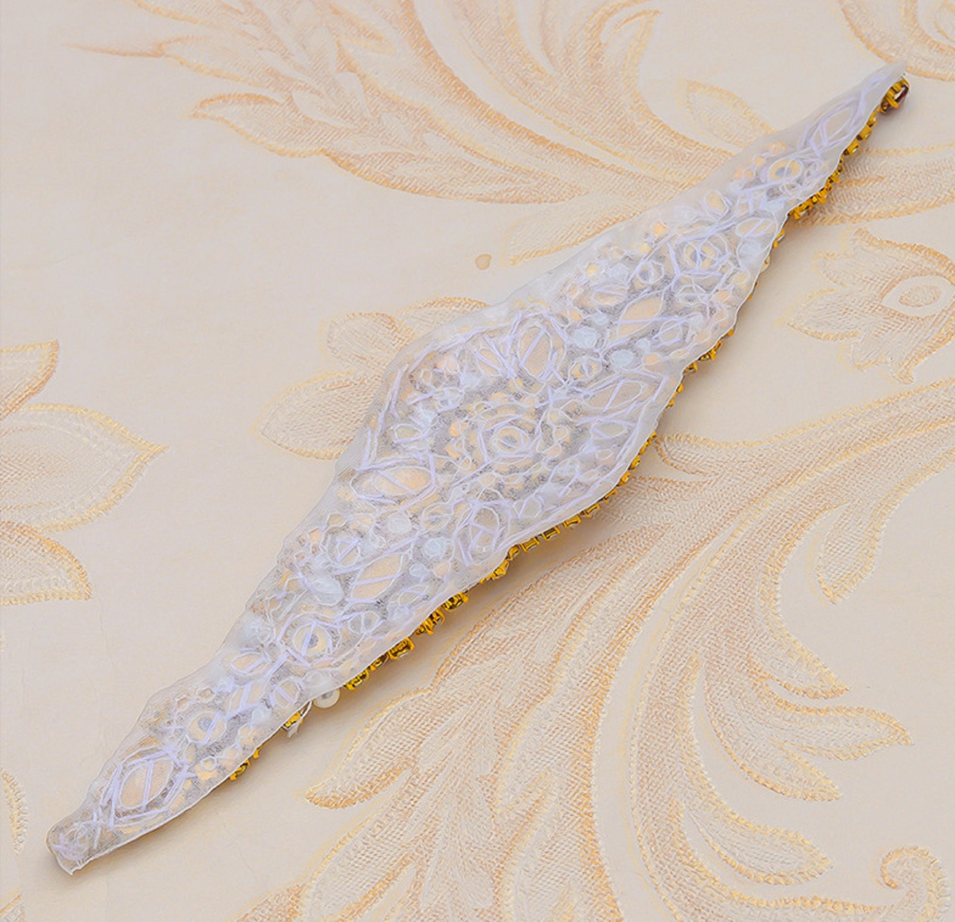Enhance any clothing or accessory with this Iron On Crystal Rhinestone Diamante Applique. Measuring 21 x 5cm, it adds a touch of sparkle and style. Made with high-quality materials, it will last through numerous washes. Perfect for DIY craft projects or adding a touch of elegance to your wardrobe.